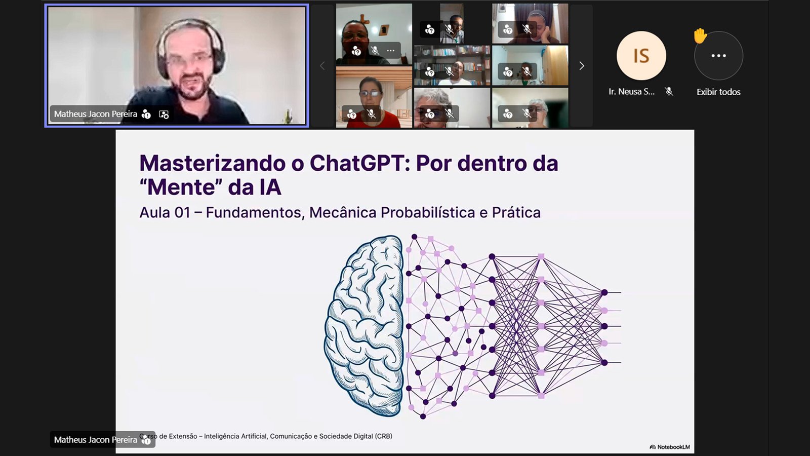 Durante a exposição, o professor apresentou fundamentos sobre o funcionamento de sistemas de Inteligência Artificial, como o ChatGPT, e abordou possibilidades de aplicação dessas ferramentas em contextos institucionais.