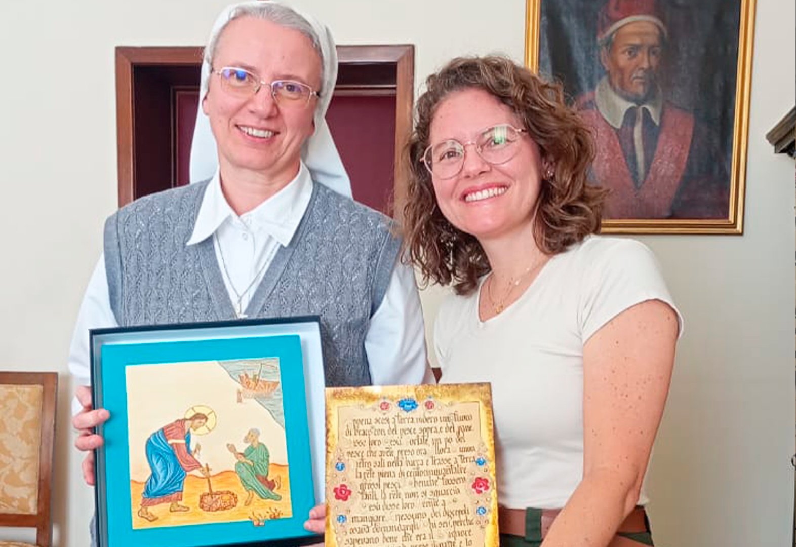 Ao receber o presente, Ir. Simona observou o ícone e recordou o momento vivido durante a Assembleia da CRB Nacional, em Brasília. “Jesus cozinheiro, que lindo!”, disse, retomando suas palavras da meditação. Agradeceu o gesto e comentou o trabalho realizado. Após a entrega, conduziu as irmãs à capela onde atua.