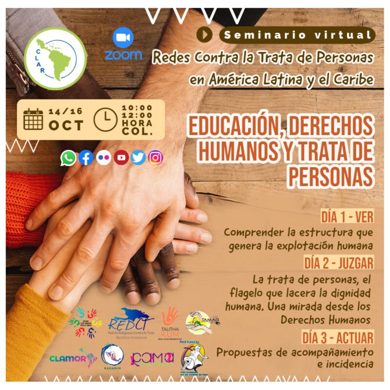 Seminario virtual Redes Contra la Trata de Personas en América Latina y el Caribe, entre os dias 14 e 16 de outubro, entre as 10h00 e 12h00. (Colômbia).
