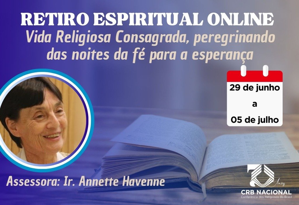 De 29 de junho a 5 de julho de 2024, a CRB Nacional realizará um Retiro Espiritual Online com o tema “Vida Religiosa Consagrada, Peregrinando das noites da fé para a esperança”. O retiro será assessorado pela Irmã Annete Havenne, ISM.